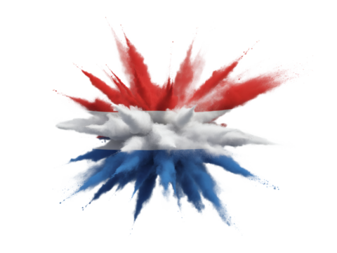 Dynamic explosion of red, white, and blue powder creating a vibrant and energetic design element for branding and promotions now