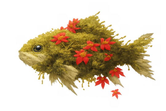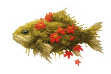 Moss covered vibrant fantasy fish with red flowers swimming, concept of environmental art and nature preservation, transparent background