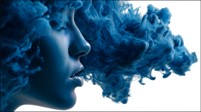 Beautiful woman's face emerging with blue ink clouds against a conceptual artistic photography isolated on white transparent background PNG cutout