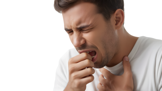 Man coughing with hand on mouth and neck in distress, isolated on white background.