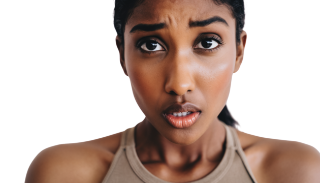 Transparent background of anxious looking woman turning