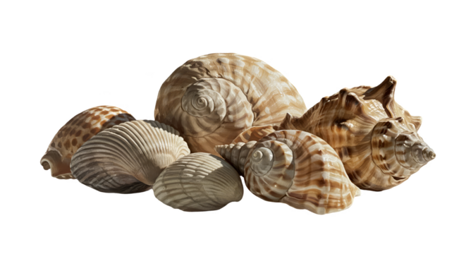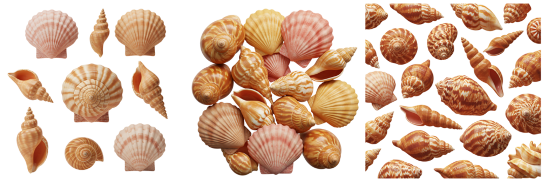 Collection of conch and sea shells with holographic tones over isolated transparent background