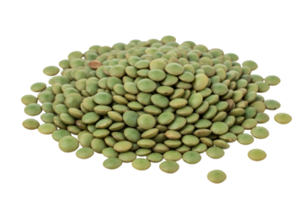 A close-up view of a pile of vibrant green lentils, displaying a multitude of rounded seeds against a pure black background.