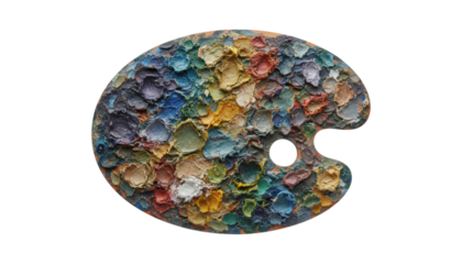 Vintage wooden artist's paint palette covered in thick, textured, dried oil paint in a multitude of colors, showcasing a beautiful impasto surface from a top-down perspective