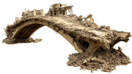 Severely Damaged Concrete Bridge with Arched Structure and Debris, cut out transparent