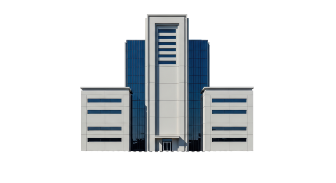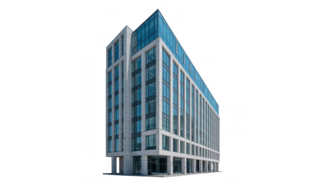 Modern office building with blue windows and gray facade isolated on a transparent background