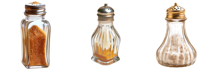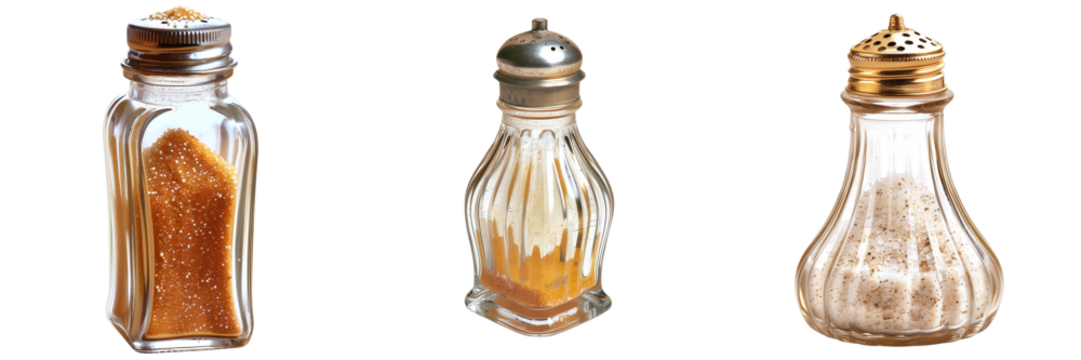 Collection of various spice shakers and containers isolated on transparent background