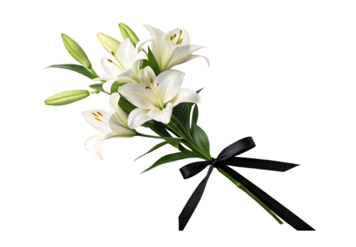 White lily blooms black ribbon condolence funeral arrangement, isolated on a transparent background