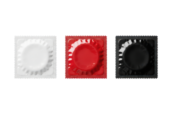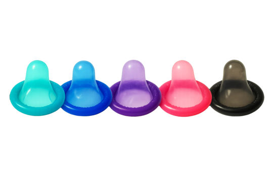 Four colorful condoms in wrappers red, pink, purple, and teal, isolated on transparent background