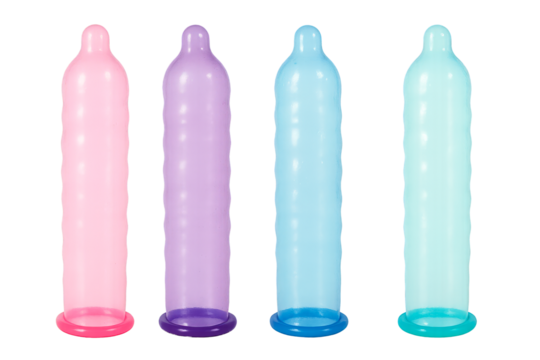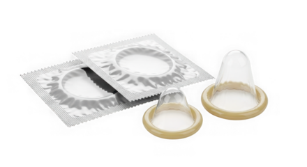 Two packaged condoms and two individual condoms displayed on a transparent background isolated on transparent background
