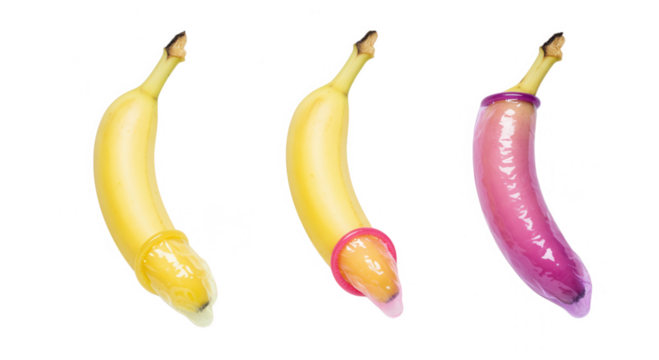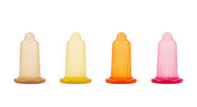 Four colorful condoms standing upright showcasing their different shades and textures isolated on transparent background