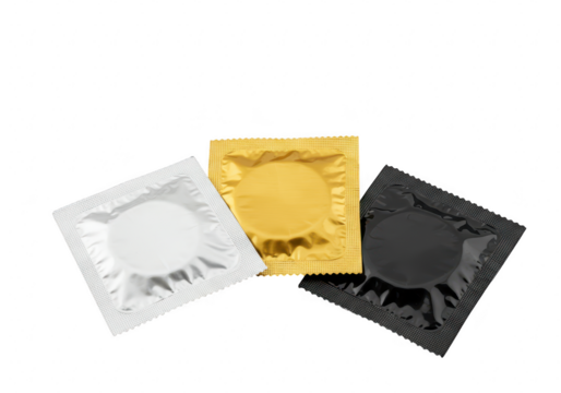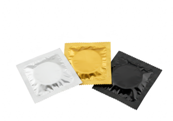 Three condoms in wrappers silver, gold, and black, isolated on transparent background