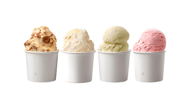 Four assorted ice creams served in white paper cups