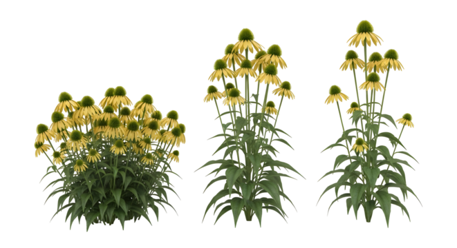 Set of yellow coneflower plants in different growth arrangements, isolated on white background for design elements