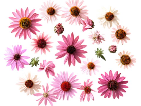 Vibrant Colorful Coneflowers Botanical Display On White Background Summer Floral Design