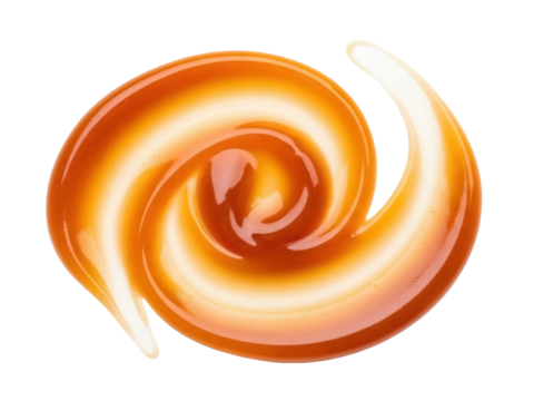 Isolated swirl of glossy caramel sauce on a surface, topping or ingredient for dessert items