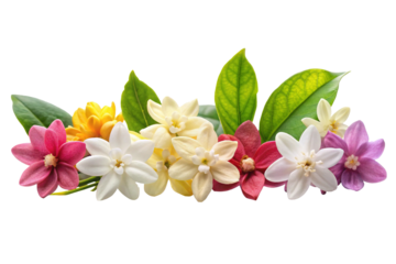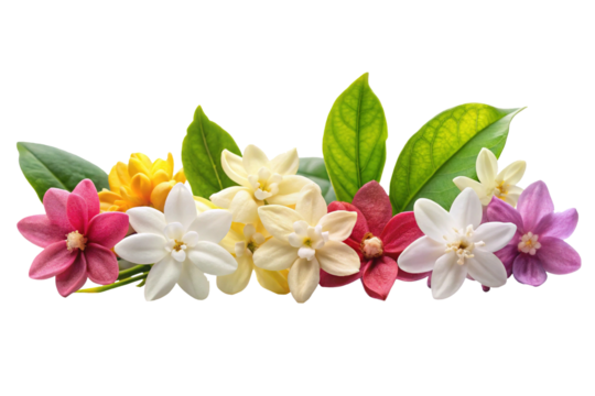 Colorful Star Jasmine Flowers with Green Leaves-Arrangement of multicolored star-shaped jasmine flowers in white, yellow, pink, and purple with green leaves, isolated on transparent background.