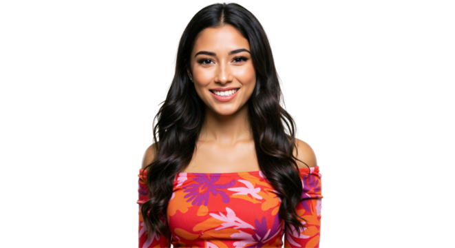 A portrait of a young Hispanic woman in a colorful floral off-the-shoulder dress, smiling brightly against a solid black background, exuding confidence and warmth.
