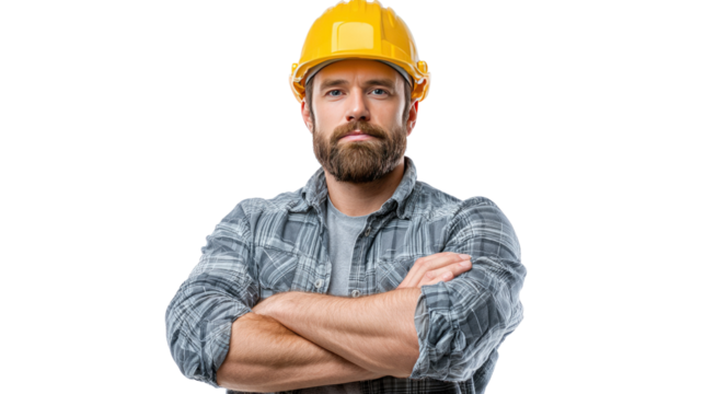 Confident male construction worker with arms crossed, wearing safety vest, isolated on white background.