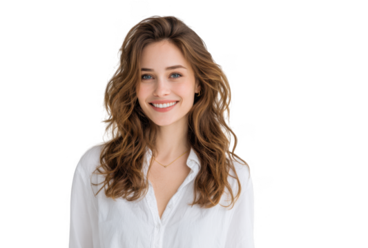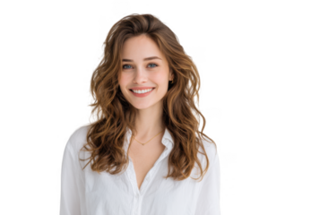A young woman with long. wavy hair and a bright smile stands against a plain white background. exuding confidence and warmth. ideal for lifestyle and beauty themes