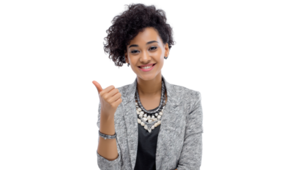 A confident woman in a blazer giving a thumbs up with a smile, isolated on a white background.