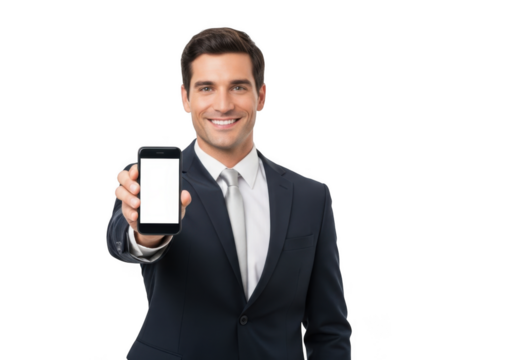 Smiling businessman in a sharp suit holding a smartphone displaying a blank screen isolated on transparent background