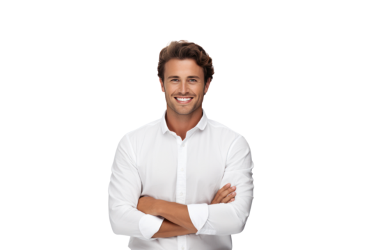 Cheerful brunette businessman wearing a white button-up shirt Smile confidently and cheerfully with your arms crossed. On a transparent background. Isolated.