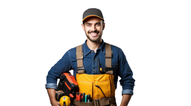 Confident construction worker in blue safety gear with helmet isolated on transparent background, PNG