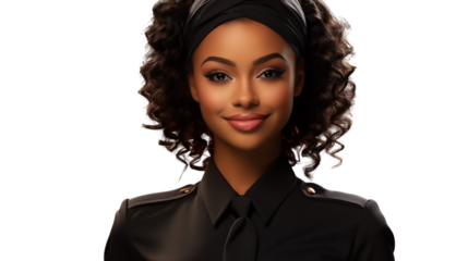 Smiling African American flight attendant, showcasing warmth and professionalism, isolated on transparent background.