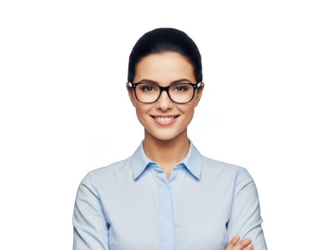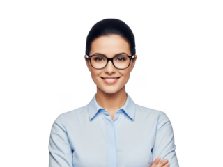 Confident businesswoman in glasses smiling and crossing arms, professional portrait against a clean white background isolated on transparent background