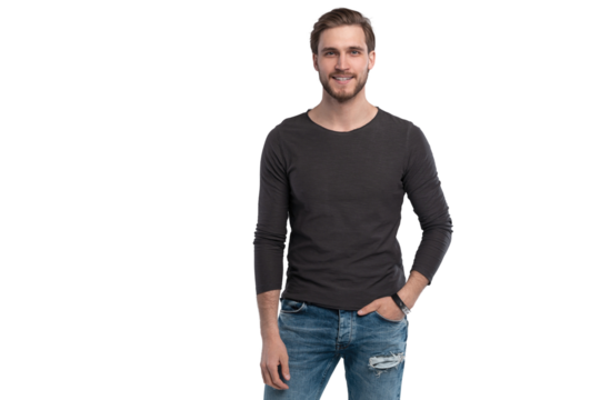 Transparent portrait of smiling man with folded arms in casual grey shirt