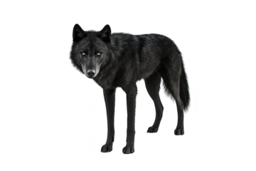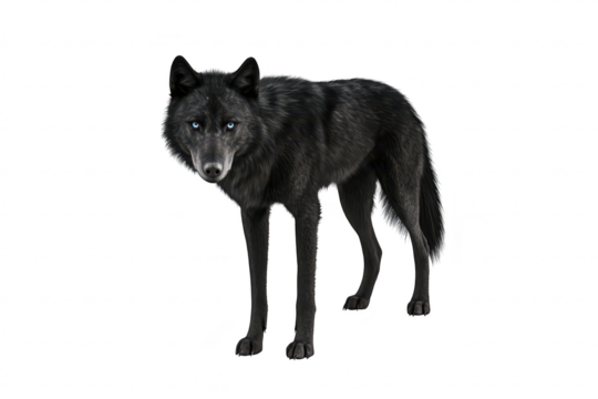 A striking black wolf stands confidently on a white background. its sleek fur and piercing blue eyes. embodying the essence of wild beauty and strength