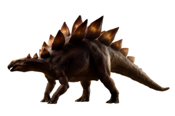 A stegosaurus moves confidently across an ancient landscape