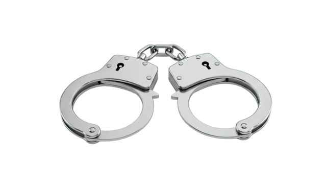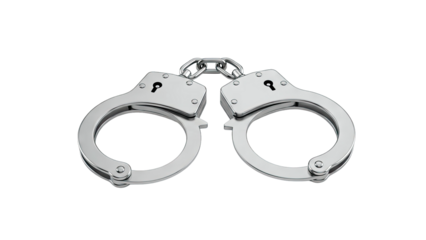 A pair of metal handcuffs on a clean white surface, ideal for use in law enforcement or police theme illustrations
