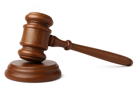 Classic wooden gavel resting on a sound block, isolated on transparent background, representing law, justice, and legal decisions