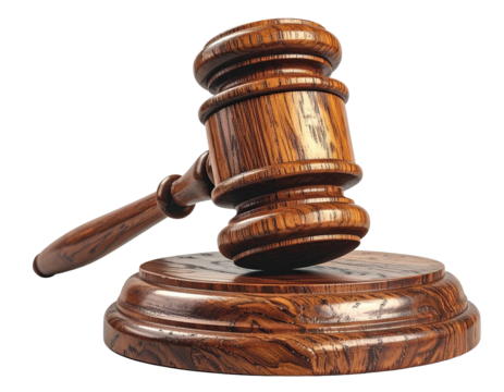 Wooden gavel resting on sound block with transparent background
