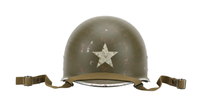 Old military helmet with a weathered star insignia and chin strap, showcasing its vintage and battle-worn appearance from a past conflict.