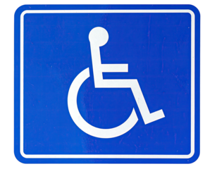 Blue square sign features a white figure in a wheelchair