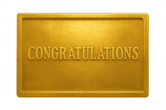 Golden congratulations sign with embossed text on a transparent background, perfect for celebrations and achievement announcements