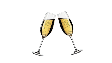 Two champagne flutes clinking together with a splash of bubbly liquid isolated on transparent background