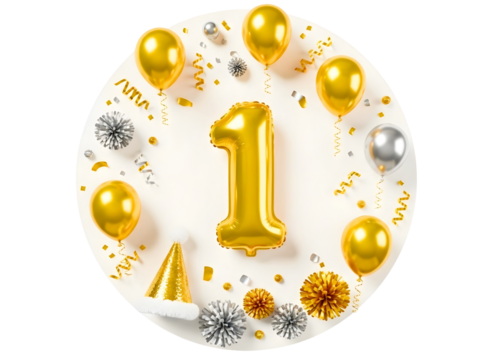 Golden number 1 balloon with party decorations isolated on transparent background