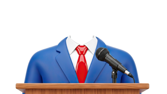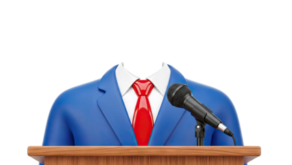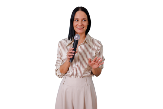 Woman speaking on stage holding microphone, giving presentation or public speech, broadcasting news, transparent background