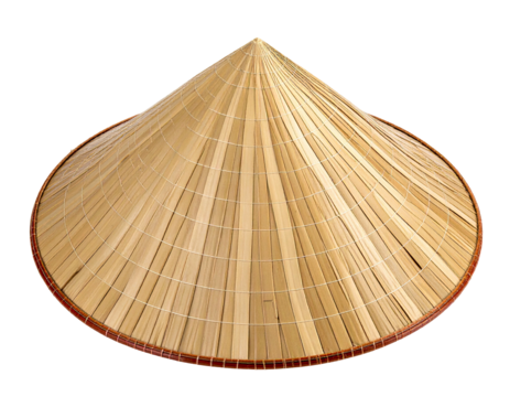 A close-up view of a traditional conical hat, made of woven bamboo and straw