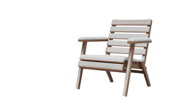 An outdoor wooden slatted chair, covered in fresh snow, evoking a serene winter scene with a clean, cut-out style. background removed