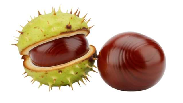 A partially opened chestnut burr reveals a shiny, brown chestnut seed inside against a transparent background. background removed
