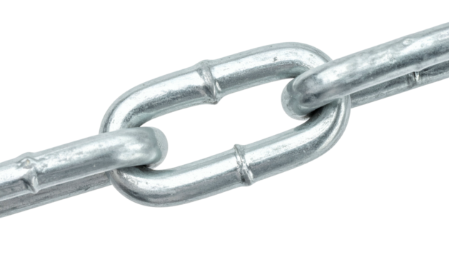 Close-up of a portion of a metal chain against a black background. The links are connected, displaying a secure connection