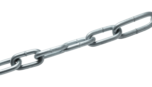 A close-up view presents a metallic chain with silver, linked segments against a stark black background, emphasizing its structure