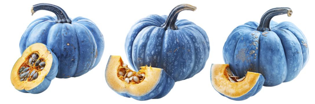 Connecticut pumpkin with green stem and cut slice isolated on white transparent background, great for autumn themes and decorations