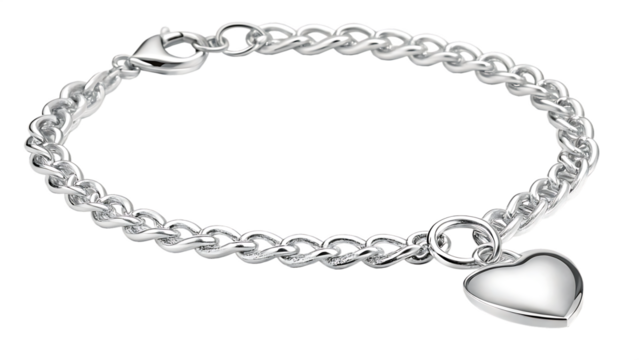 Silver charm bracelet with various charms including pearls, flowers, fruit, and heart, isolated on transparent background
