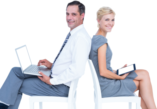 Smiling business people using technologies on chairs